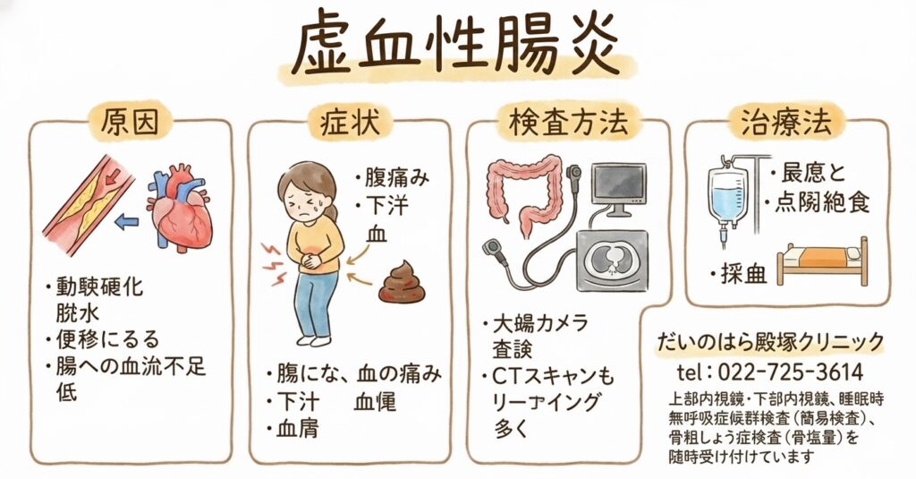20世紀までは、高齢者に多い疾患とされていました。下痢、強い便秘をきっかけに大腸の蠕動が急激に亢進して大腸への酸素需要に供給が追いつかないときに発症します。